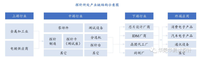 探針作為半導(dǎo)體產(chǎn)品測試的關(guān)鍵部件,處于半導(dǎo)體產(chǎn)業(yè)鏈中游的測試設(shè)備及其零部件制造行業(yè),探針行業(yè)的上游為金屬加工,電鍍行業(yè),下游為芯片設(shè)計、晶圓制造及晶圓代工、封裝與測試行業(yè),經(jīng)測試達(dá)到設(shè)計規(guī)范要求的半導(dǎo)體產(chǎn)品最終應(yīng)用與消費電子、汽車電子、通訊設(shè)備等眾多領(lǐng)域。