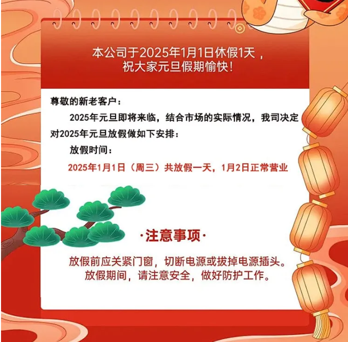 2025年元旦即將來臨,結(jié)合市場的實際情況,我司決定對2025年元旦放假做如下安排: