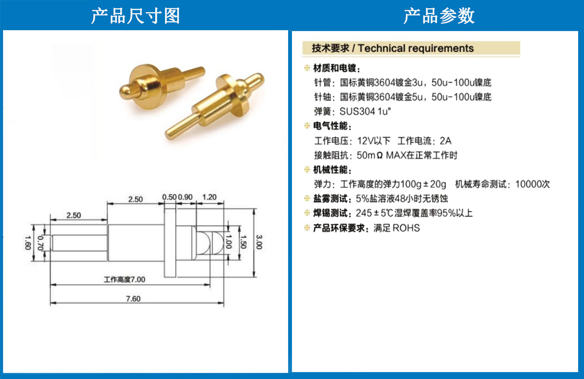 3.0*7.6帶尾頂針(焊盤上移) 當(dāng)前位置:首頁 » POGO PIN充電彈簧頂針 » 彈針系列