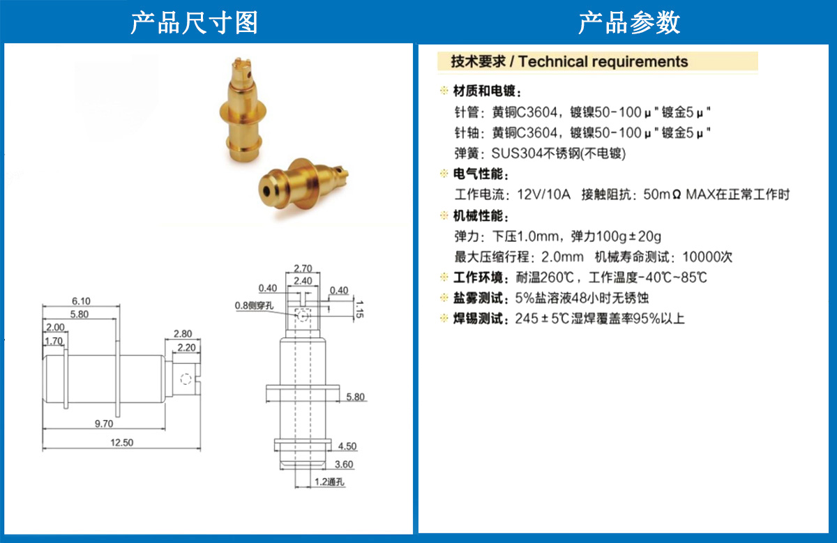 產(chǎn)品型號:5.8*12.5彈針 所屬分類:電流探針 產(chǎn)品優(yōu)勢:產(chǎn)品定位精度高、產(chǎn)品過載穩(wěn)定、產(chǎn)品測試誤判率低 主要應(yīng)用于:智能產(chǎn)品、藍牙耳機、藍牙手環(huán) 產(chǎn)品介紹:這個針通常用于智能手表,藍牙耳機上的有充電的功能,但是探針總體來說還是測試的 熱線電話:400-183-6682